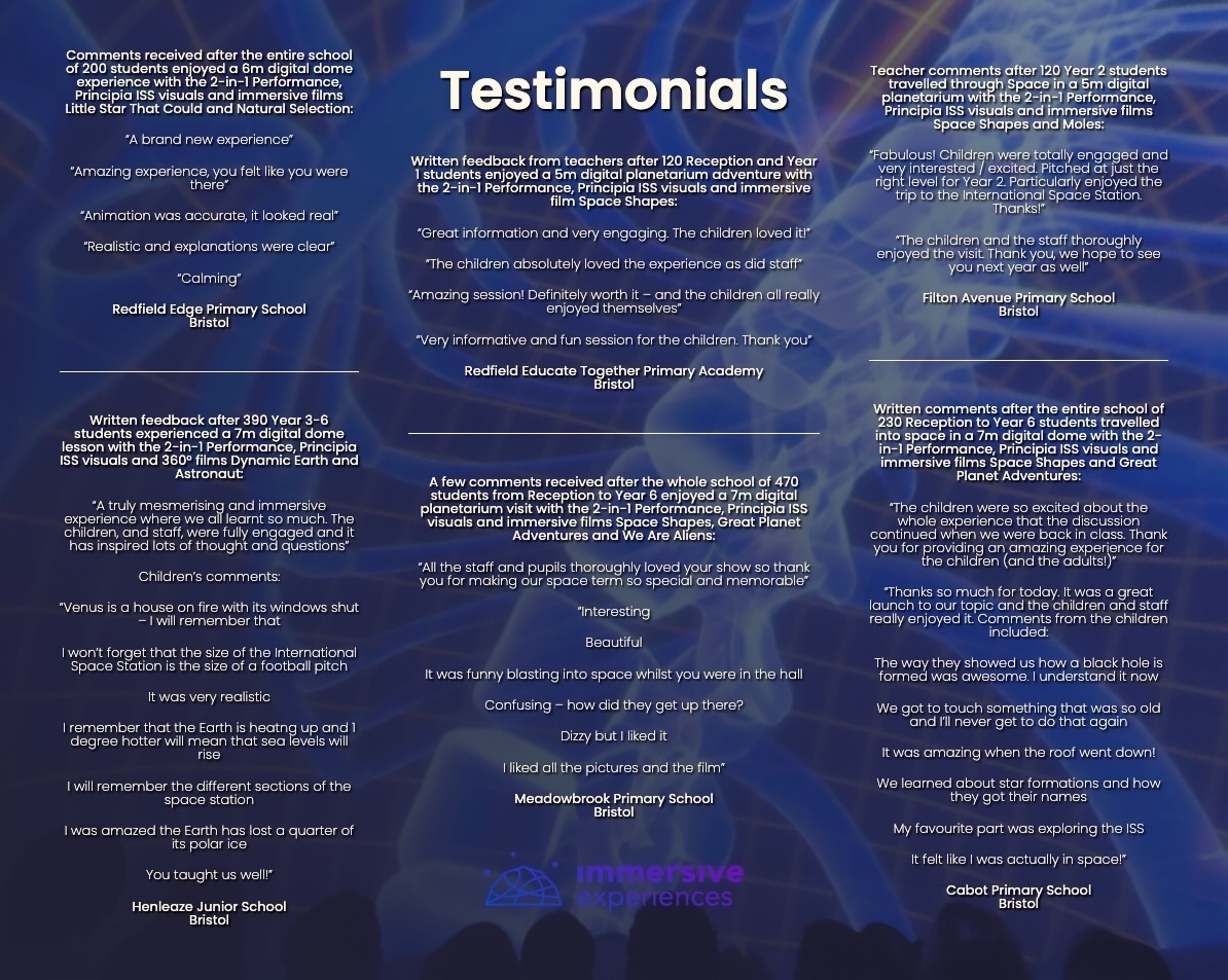 On 1st December 2015 Immersive Theatres became the first UK mobile planetarium provider to receive the UK government's Learning Outside the Classroom Quality Badge.