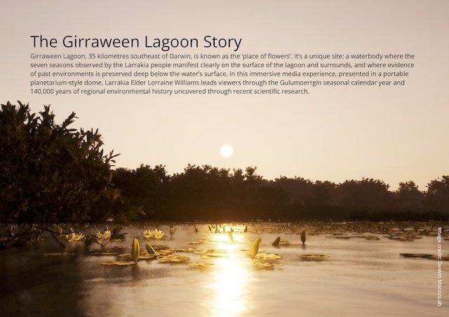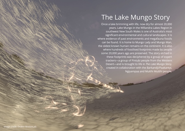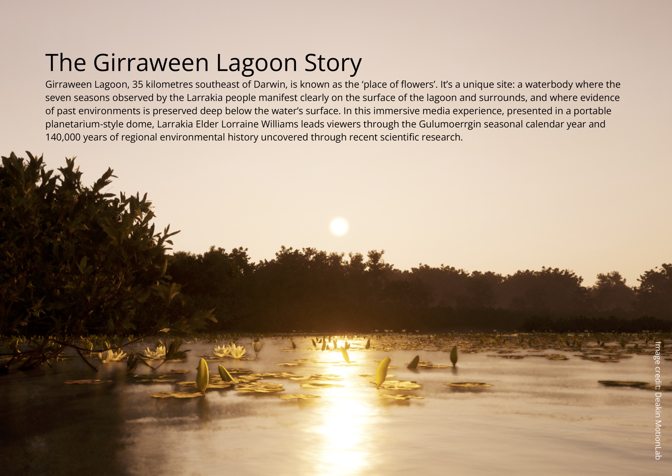 In this spectacular 360° experience, we follow Ancestors on a journey deep into Country. We move across ancient superhighways connecting the entire continent of Australia, sharing deep time stories illuminated by new relationships between emerging research and First Nation knowledge.